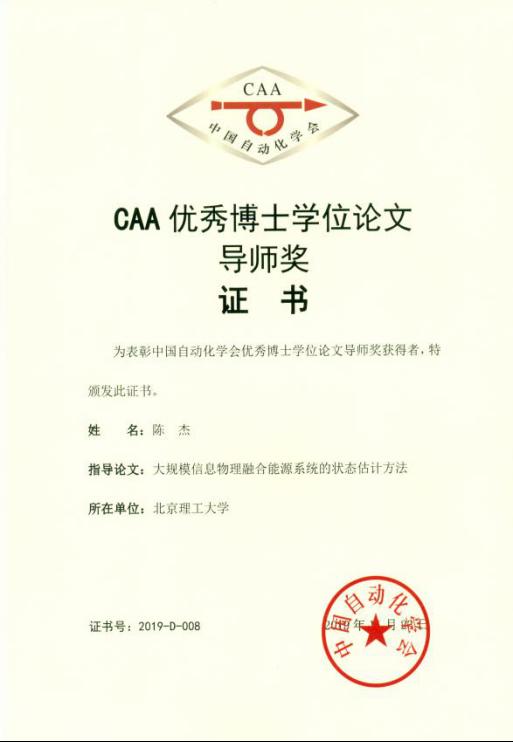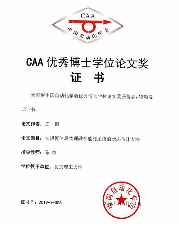 近期,自动化学会公布了2019年度CAA优秀博士学位论文奖评审结果,我实验室王钢博士的论文《大规模信息物理融合能源系统的状态估计方法》获得CAA优秀博士学位论文奖,导师陈杰教授获得CAA优秀博士学位论文导师奖。